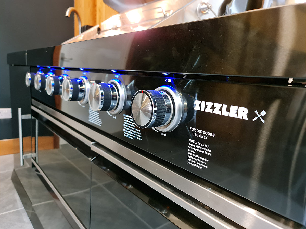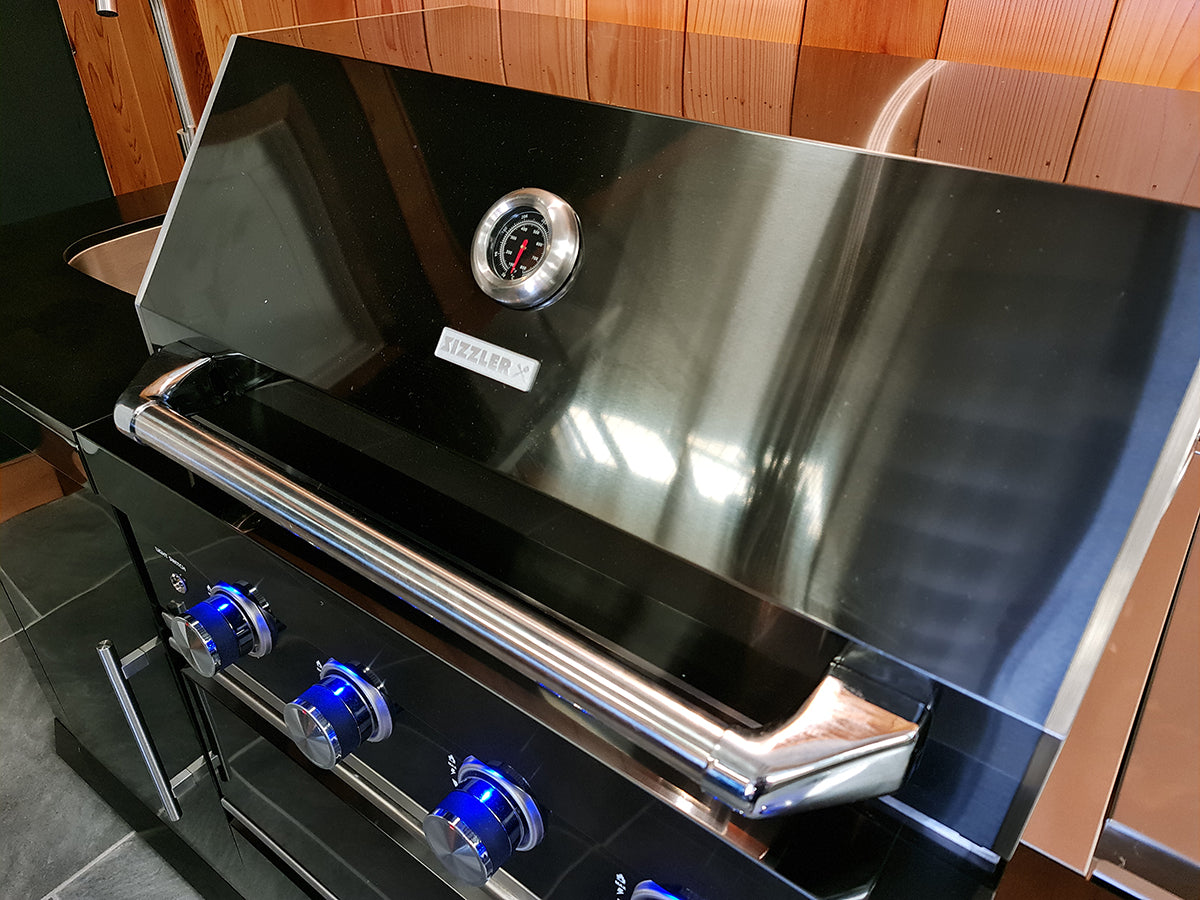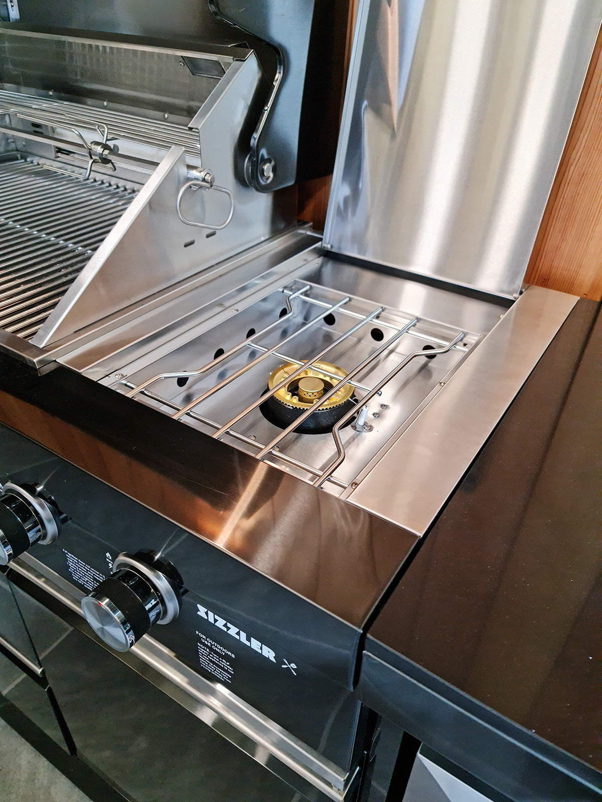Love a good BBQ? Take your BBQ dining experience to a whole other level by adding a Sizzler Outdoor Kitchen. With all the features to enhance your outdoor dining, we are confident that the Sizzler will be the only outdoor kitchen you’ll ever need! With The Sizzler having four main stainless steel burners on the grill, you’ll never run out of space to cook! It also comes with an additional infrared back burner and has a useful side burner for cooking your favourite sauces and vegetables. The Sizzler comes with a stainless steel hood. The built-in thermometer gauge allows you to regulate the temperature for that perfect slow cooked roast. It also comes with a lockable fridge and sink. The Sizzler has your drinks protected, illuminating them with blue LED lighting! The integrated motorised stainless steel rotisserie makes it simple to cook and gives you excellent results.